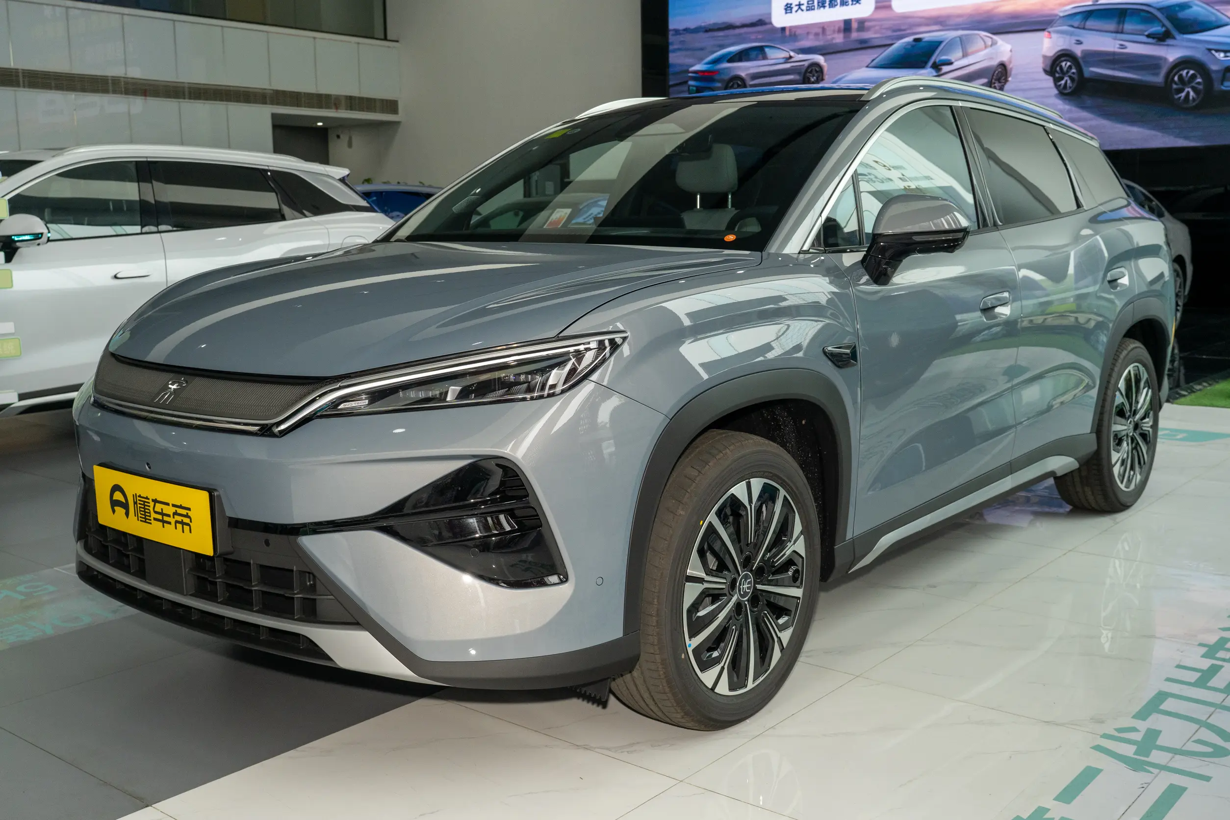 Song Ultra EV - среднеразмерный внедорожник (4850 × 1910 × 1670 мм, колёсная база 2840 мм) в фирменном стиле BYD: выразительные фары, хромированная отделка, плавные линии кузова. Внутри - 15,6‑дюймовый экран, 10,25‑дюймовая ЖК‑панель приборов и рычаг переключения передач на рулевой колонке.