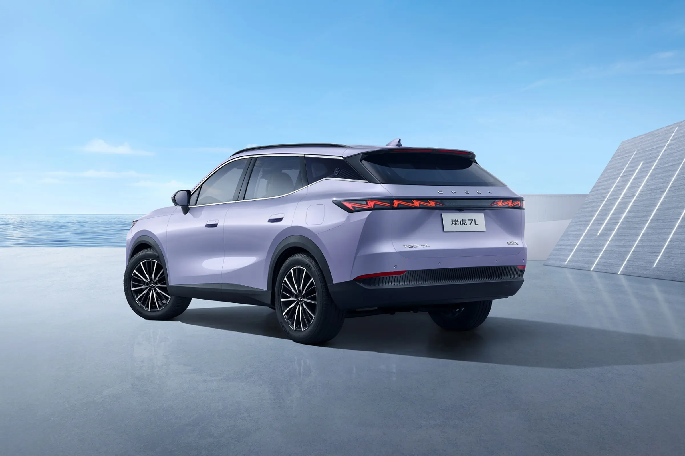 Сбоку Tiggo 7L выделяется «парящей» крышей и полускрытыми дверными ручками. Окна дополнительно украшены хромированными накладками. Сзади Tiggo 7L тоже смотрится выразительно: задние фонари имеют необычный световой рисунок, а на спойлере на крыше расположен высоко расположенный стоп‑сигнал. В нижней части бампера присутствуют красные светоотражатели и сетчатый дизайн — деталь, подчёркивающая спортивный характер модели.