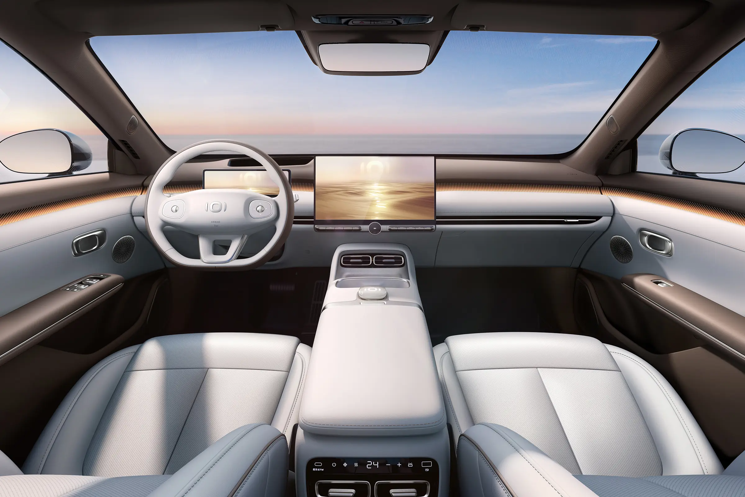 В салоне - минимализм: прямоугольная приборная панель, четырехспицевый руль, большой центральный экран управления на базе чипа MTK8676, скрытый разъем кондиционера и 256-цветная подсветка салона. Аудиосистема оснащена 20 динамиками. Также в салоне предусмотрено 38 отсеков для хранения.