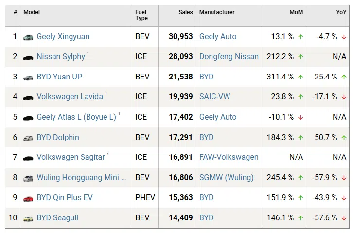 Лидеры рынка в нижнем сегменте показывают неоднозначную динамику. Geely Star Wish лидирует с 30 953 проданными единицами, за ним следует Nissan Sylphy с 28 093 продажами. При этом популярные бюджетные модели, такие как Wuling Hongguang Mini EV и BYD Seagull, продемонстрировали резкое падение продаж — на 57,9% и 57,6%.